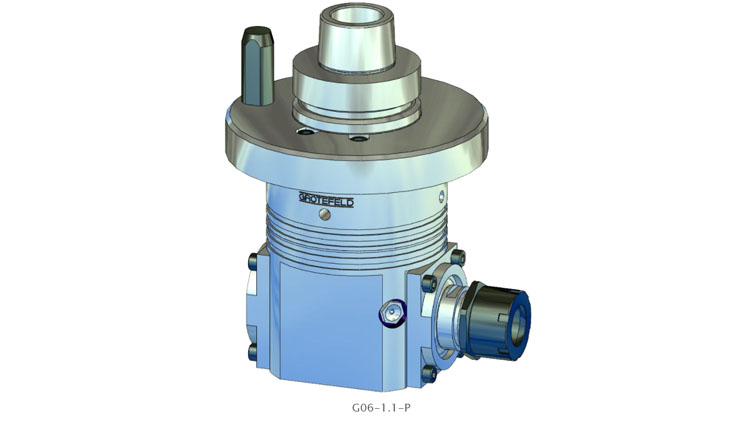 G06-1.1 系列角頭具有連續(xù)加工主軸。驅(qū)動速度以 1:1.55 的比例傳遞到刀架。間歇運行時主軸最高轉速可達 20,000 rpm。