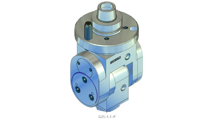 G25系列的角頭具有可根據刻度進行無級調整的加工主軸。設置范圍從 0°(垂直)擴展到兩側最大 100°。主軸的旋轉方向與驅動器的旋轉方向相反。